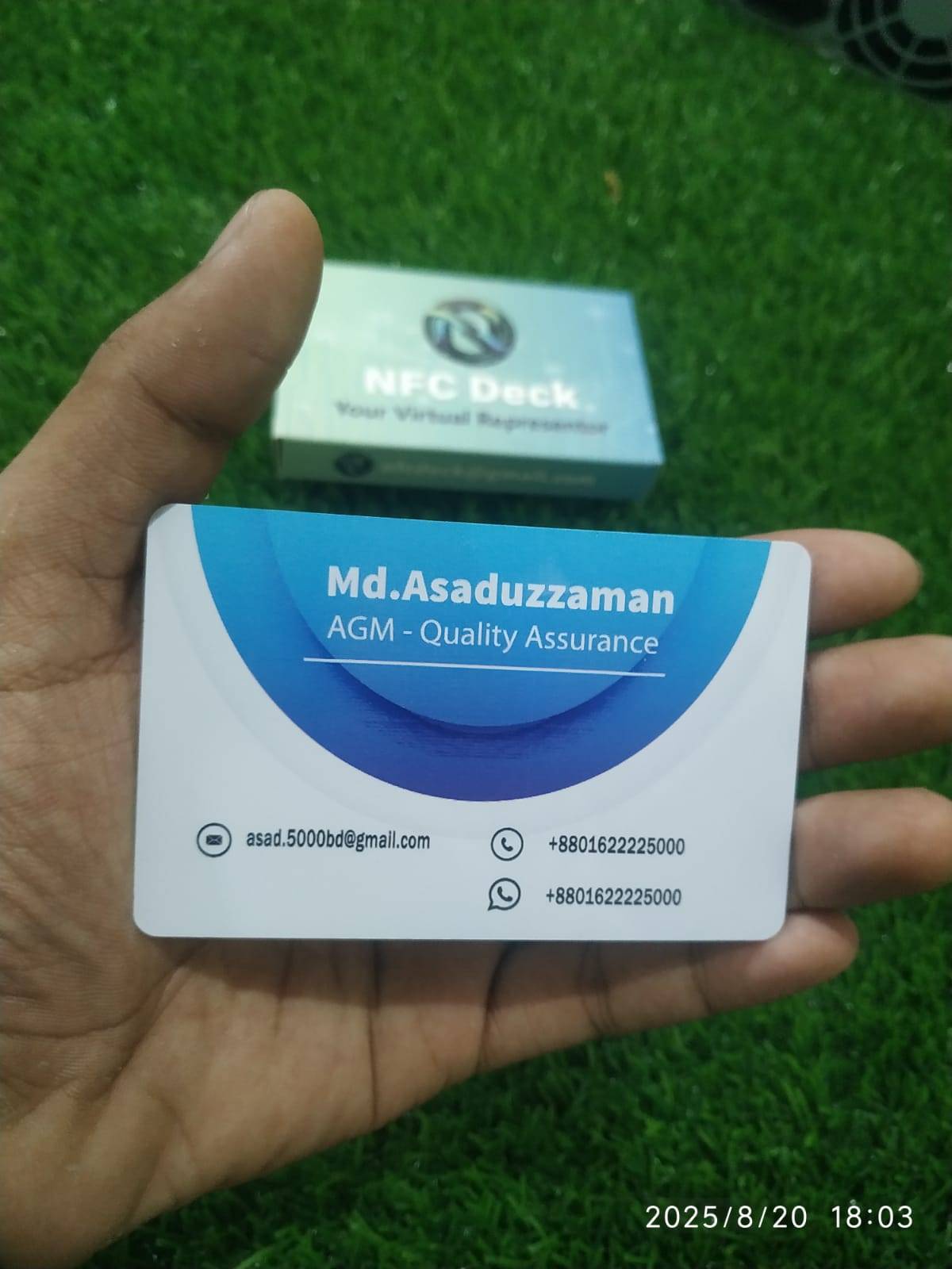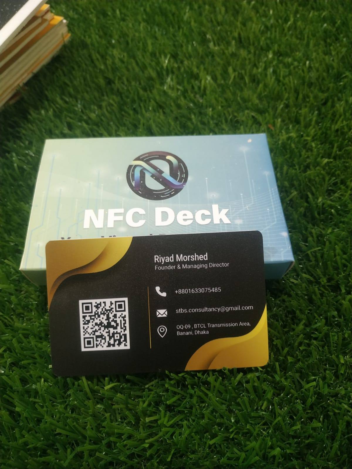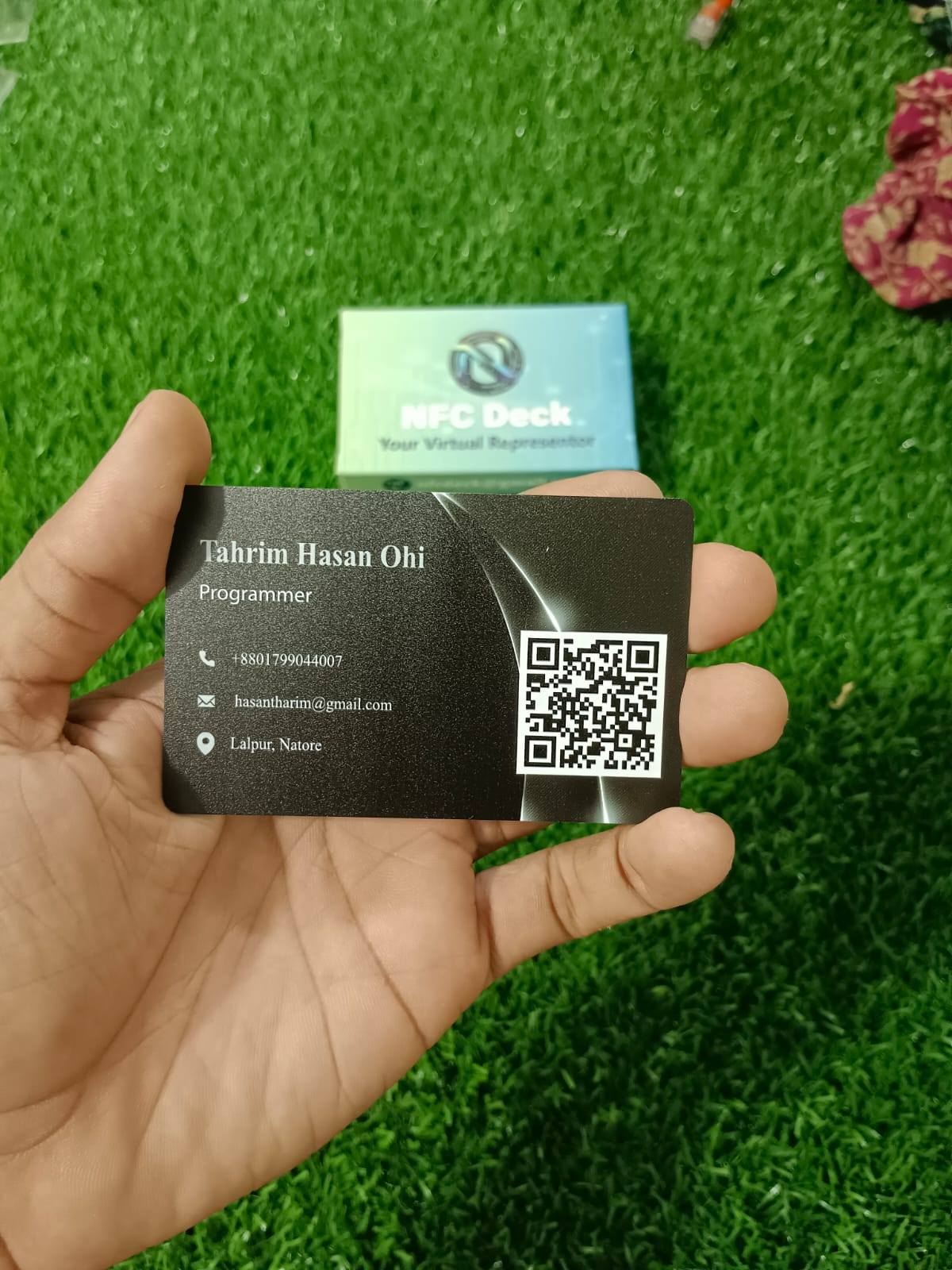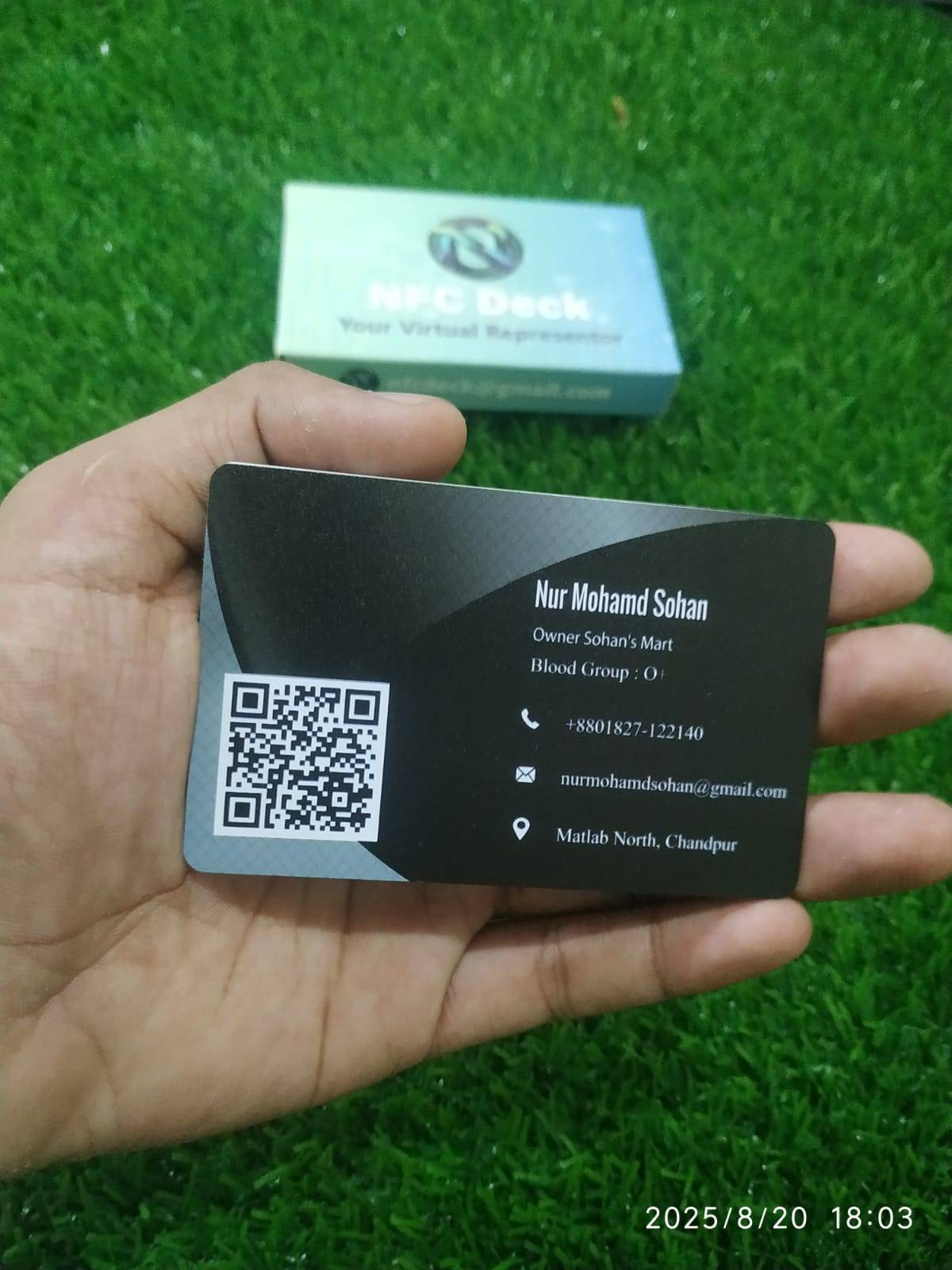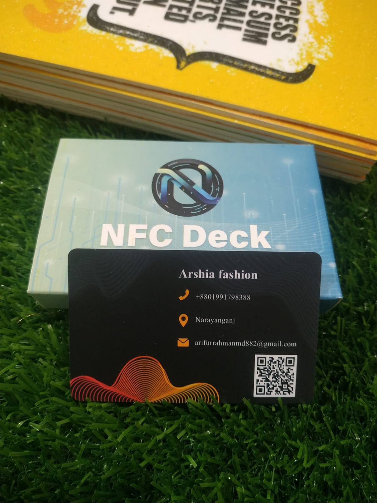 Printed NFC smart business card photos from Bangladesh with NFC tap and Dynamic QR, waterproof PVC, editable digital profiles—real prints and customer shots by NFC Deck.