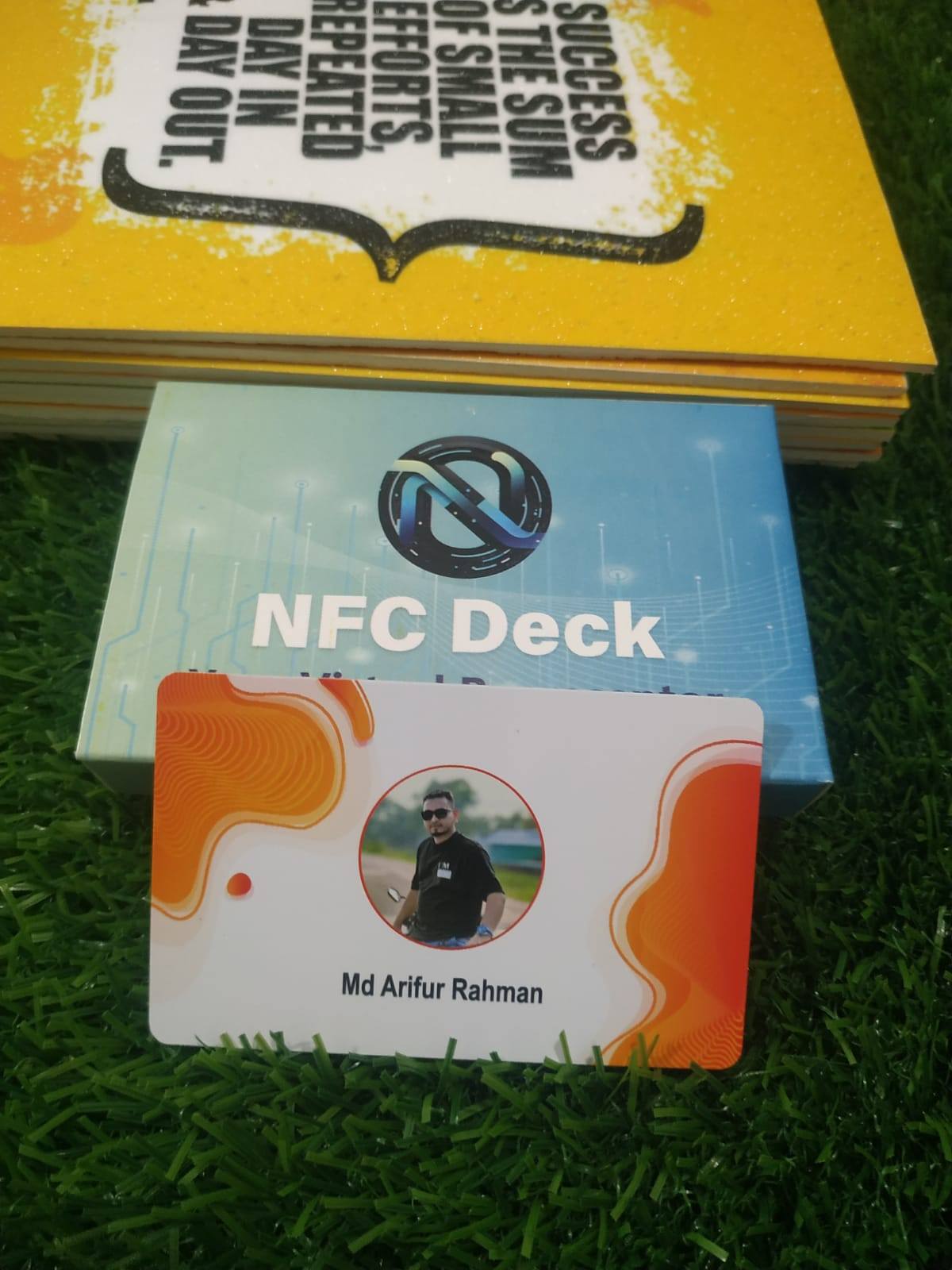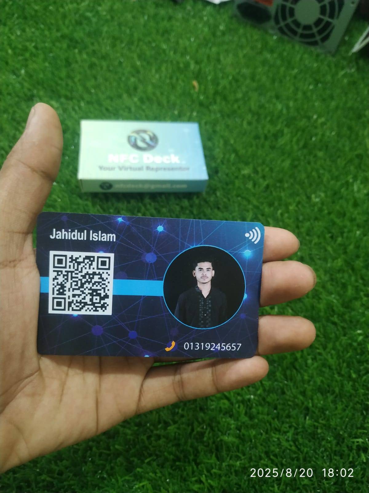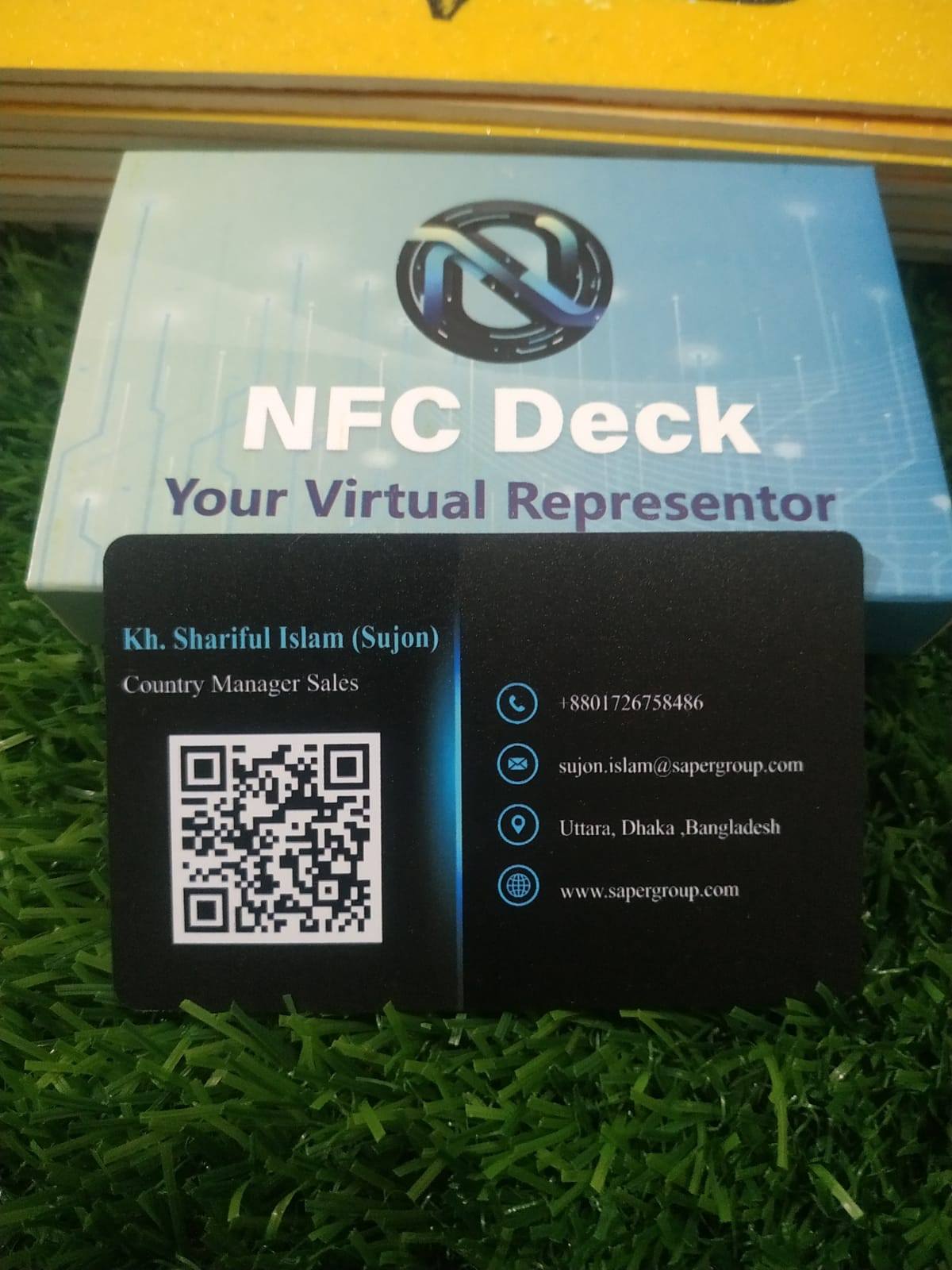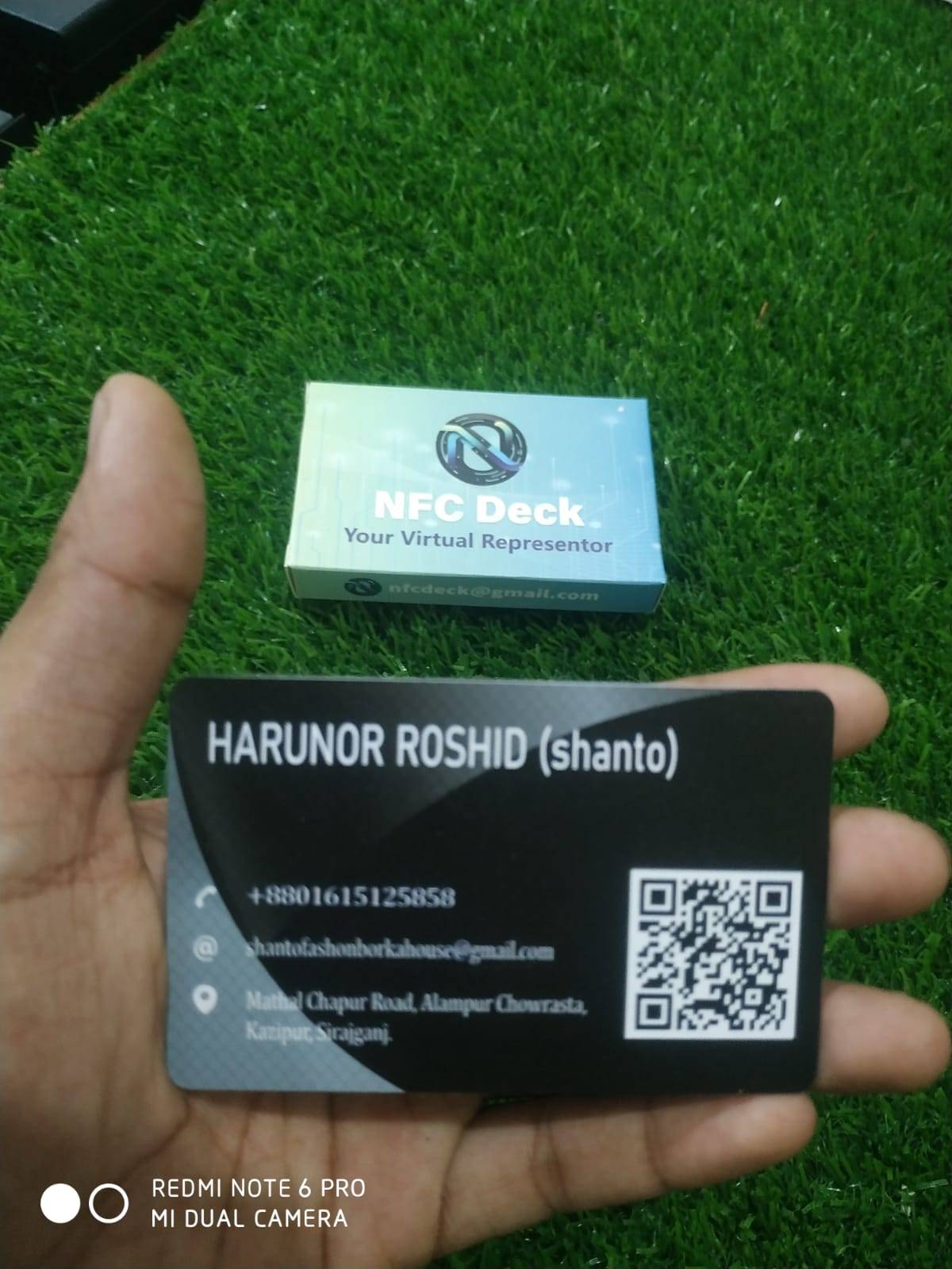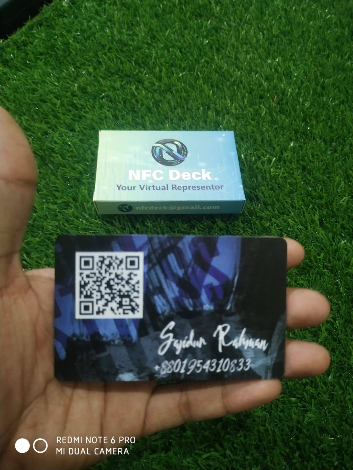 Printed NFC smart business card photos from Bangladesh with NFC tap and Dynamic QR, waterproof PVC, editable digital profiles—real prints and customer shots by NFC Deck.