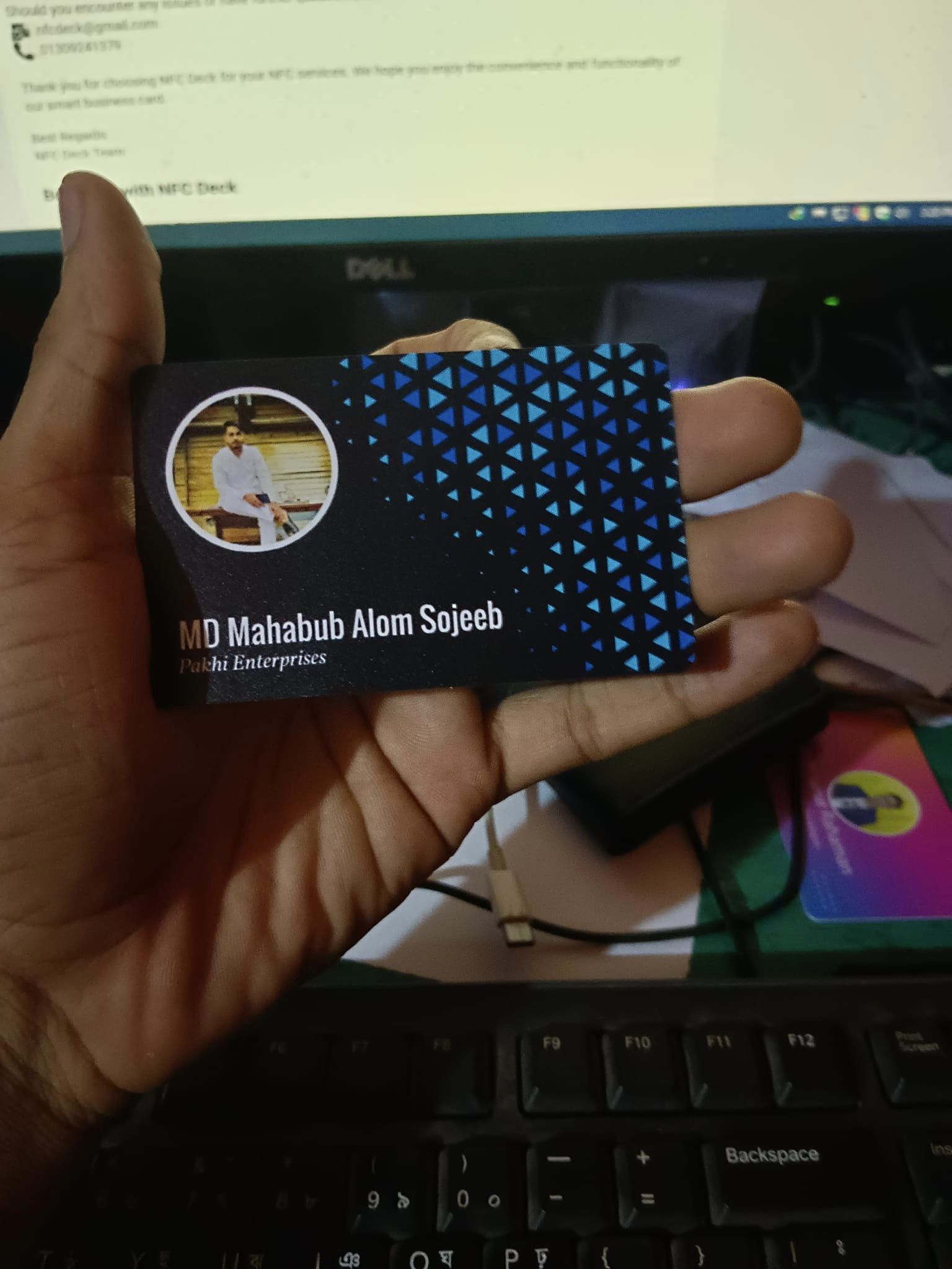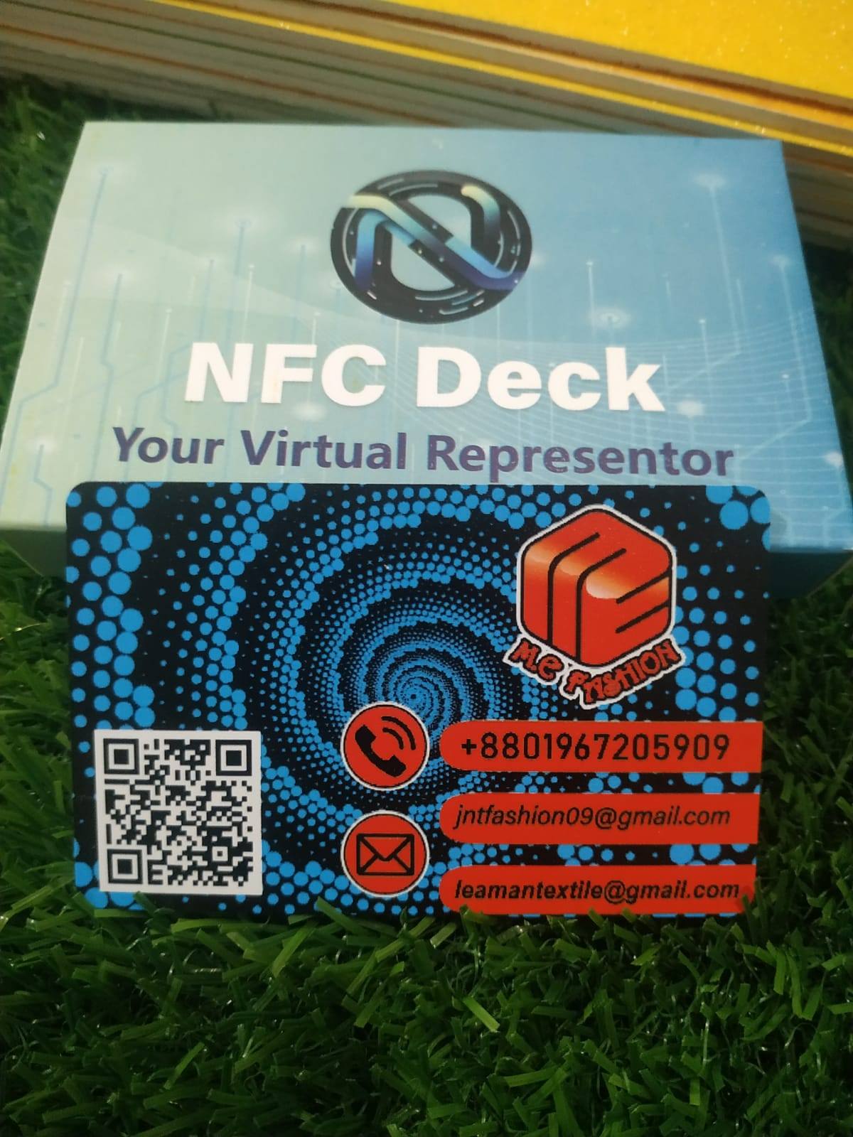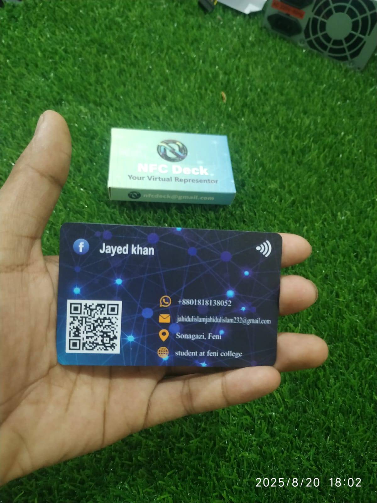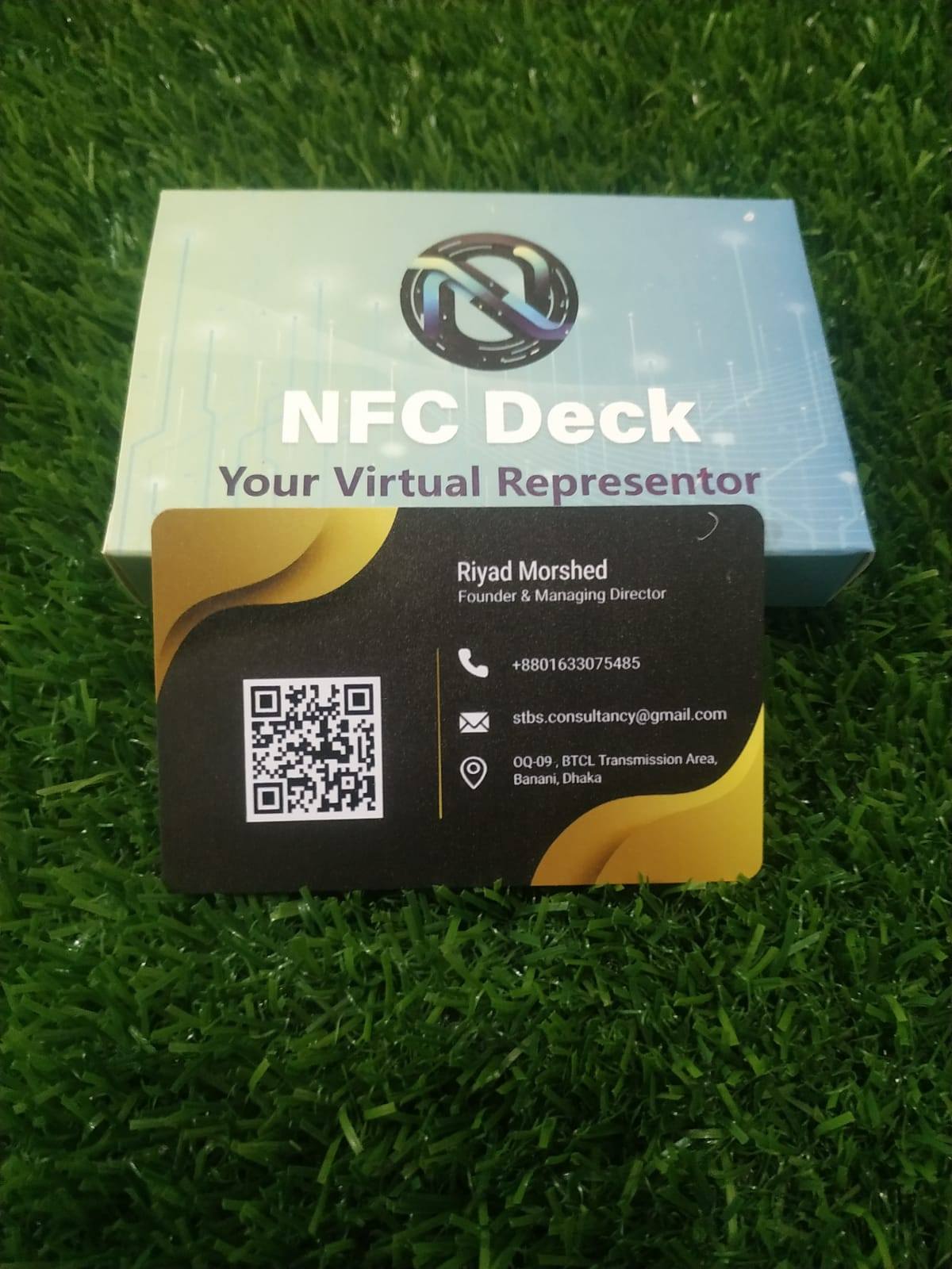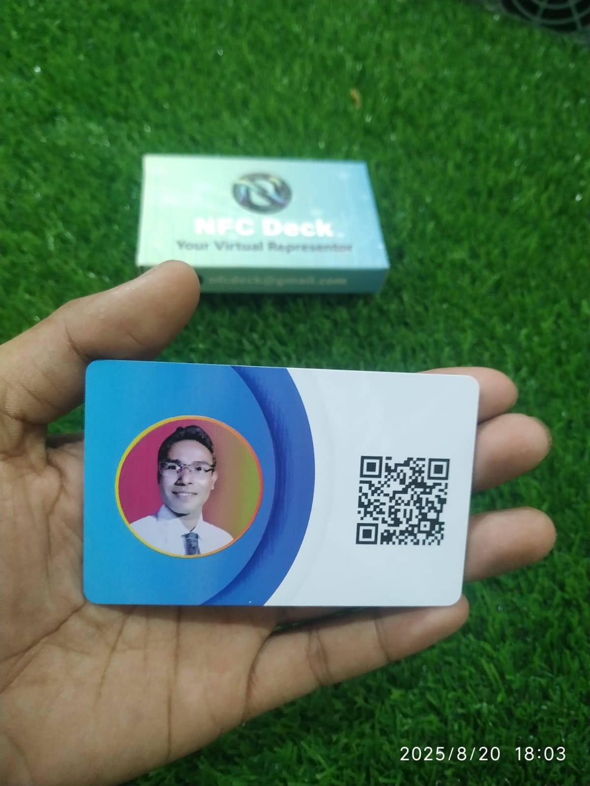 Printed NFC smart business card photos from Bangladesh with NFC tap and Dynamic QR, waterproof PVC, editable digital profiles—real prints and customer shots by NFC Deck.
