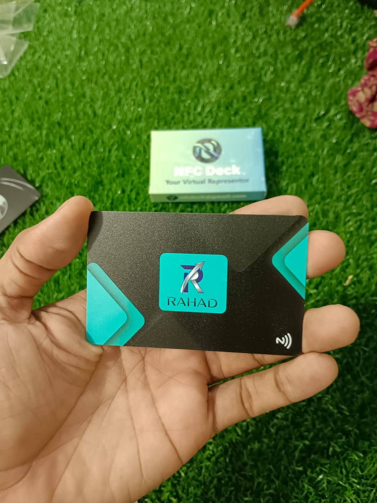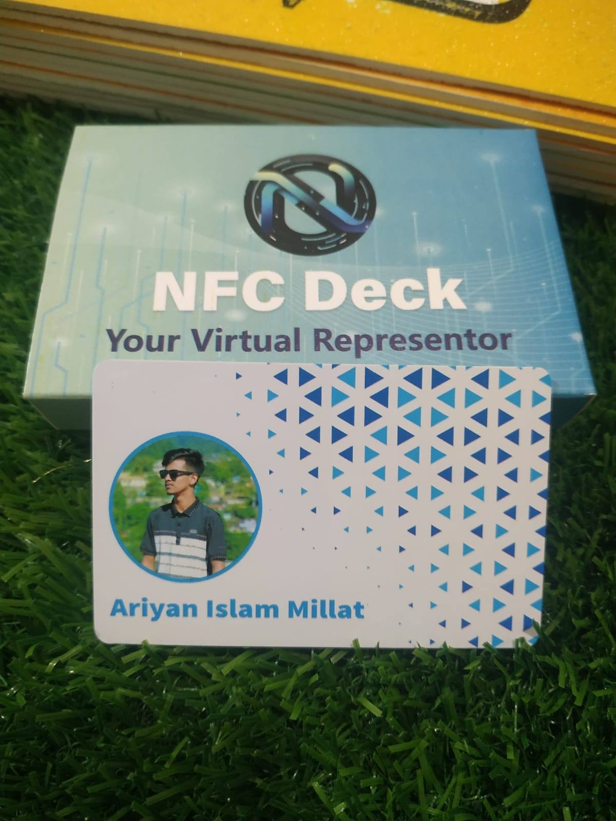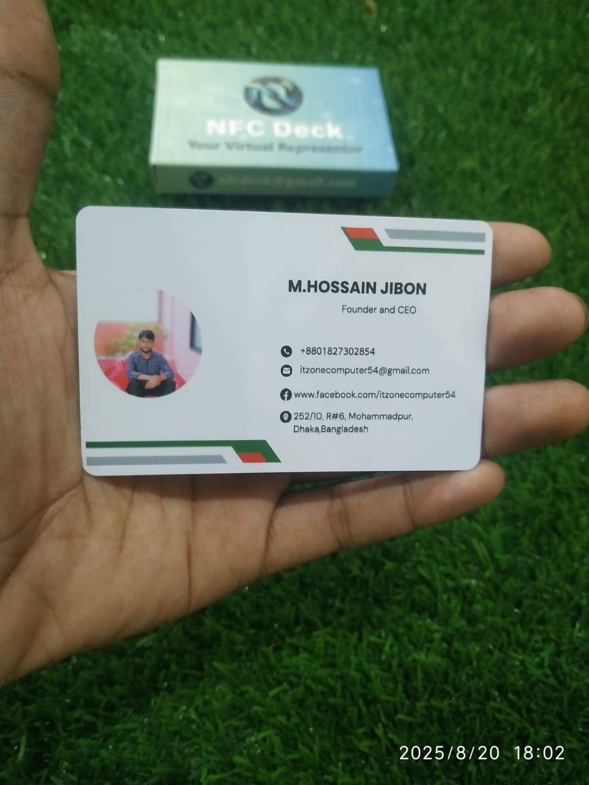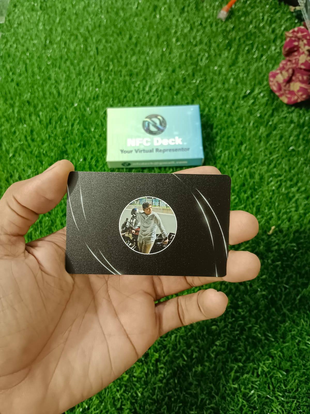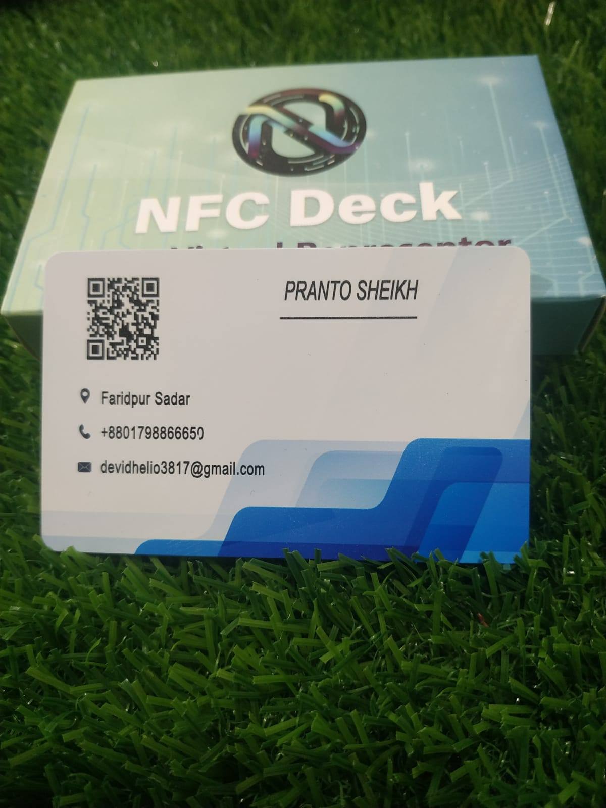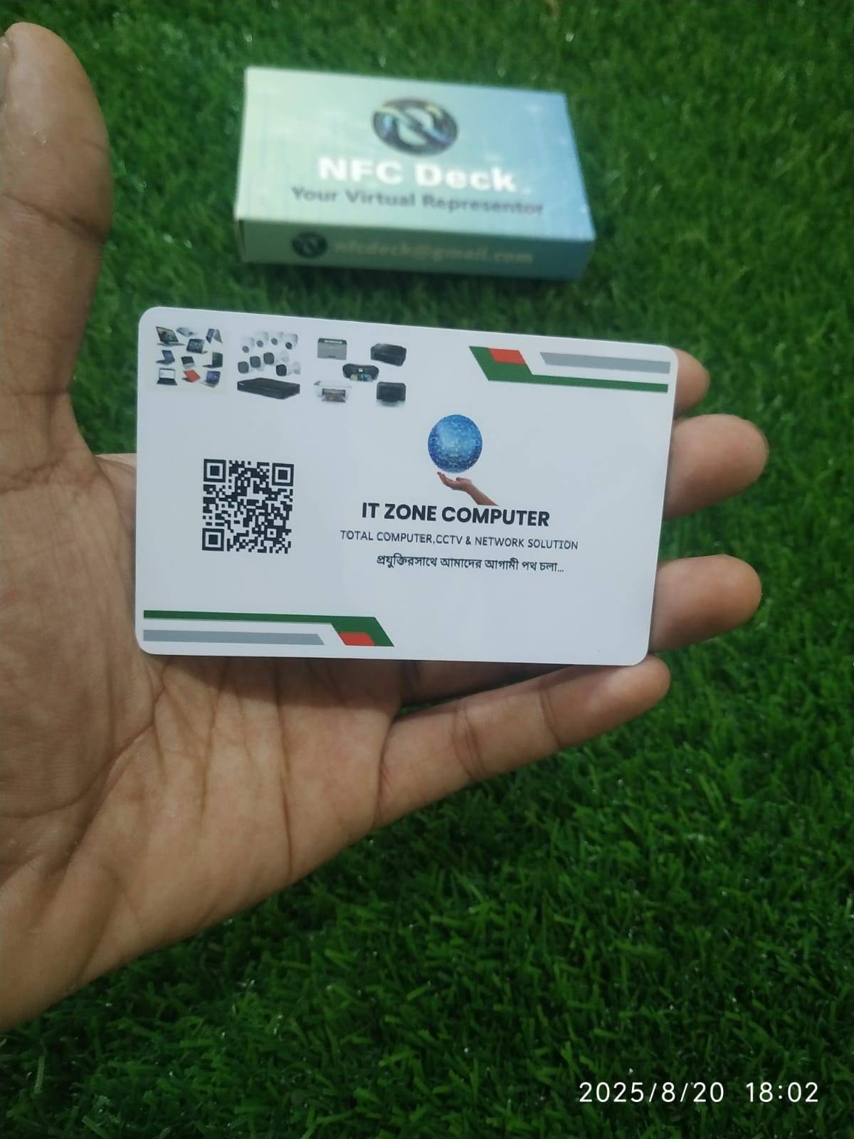Printed NFC smart business card photos from Bangladesh with NFC tap and Dynamic QR, waterproof PVC, editable digital profiles—real prints and customer shots by NFC Deck.